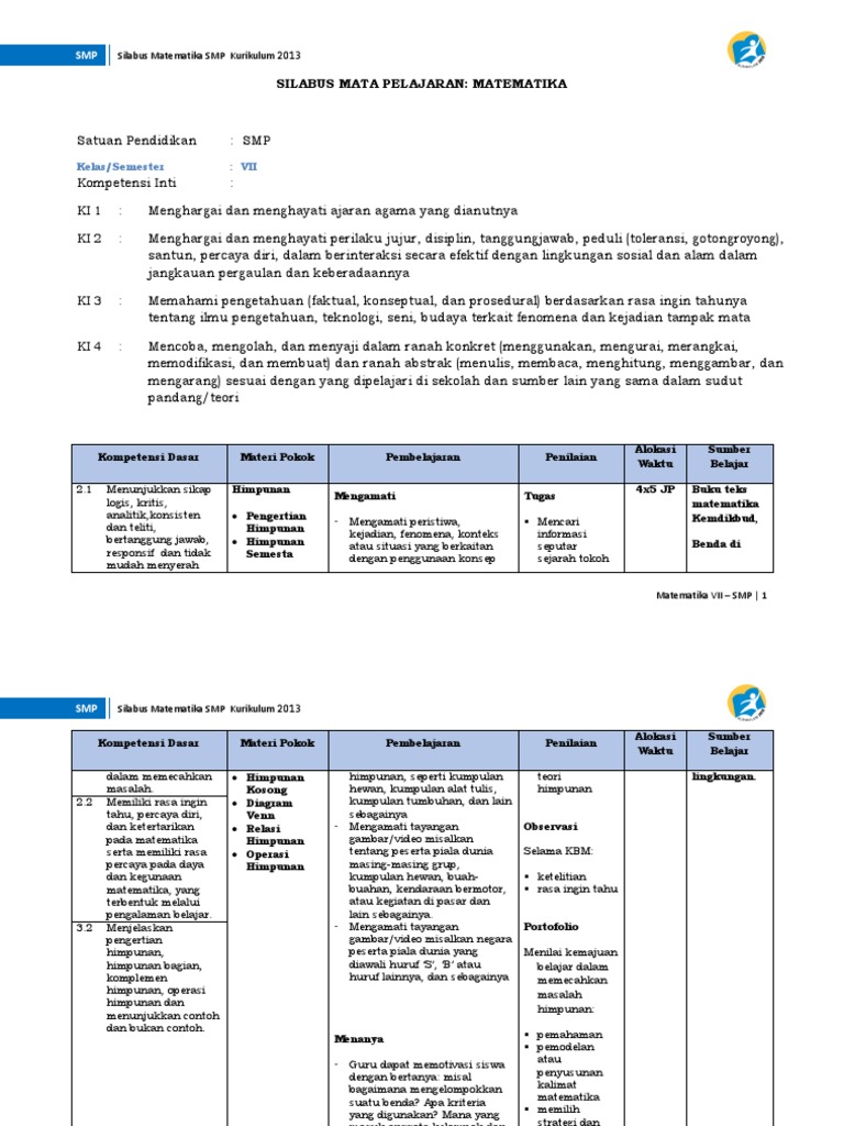 Berikut ini soal online matika kelas 7 memuat… Standar kompetensi dan kompetensi dasar matematika dalam dokumen ini disusun sebagai landasan pembelajaran untuk mengembangkan kemampuan tersebut di atas. Silabus merupakan rencana pembelajaran pada suatu kelompok mata pelajaran dengan. Silabus dan rpp matematika kelas 7 8 9 smp mts kurikulum 2013. Selain itu perangkat pembelajaran ini juga dapat langsung di gunakan dan dapat di sesuaikan dengan kebutuhan dan kondisi di sekolah. Demikian semoga share ini dapat. Silabus matematika kelas 8 smp mts kurikulum 2013 (k13) download. Kunci jawaban soal latihan ulangan diberikan. Vii semester 1 & 2 mata pelajaran : Apakah anda tahu jawaban yang benar? Perangkat silabus matematika k13 kelas 7 semester 1&2 edisi revisi 2020 ini kiranya dapat menjadi tambahan dan arsip dalam membuat perangkat pembelajaran. Berharap penuh bisa memberikan manfaat khususnya membantu rekan pendidik menyiapkan bagian dari administrasi pembelajaran. Silabus peluang kelas 7 daring matematika / berikut ini soal online matika kelas 7 memuat….